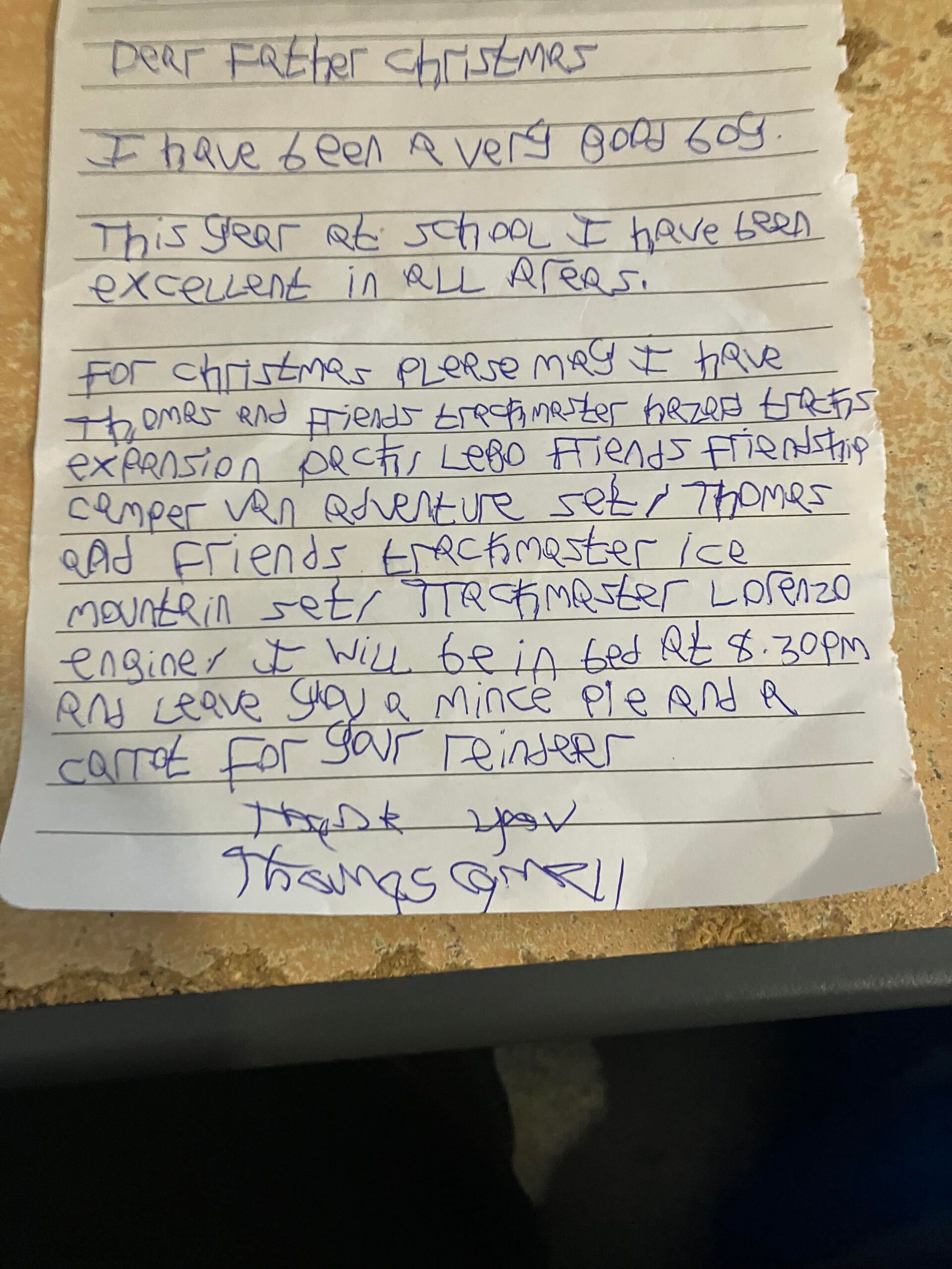 So Thomas, alongside Nanny Louise, went to visit Father Christmas at the Cotswold Reindeer Herd. Before he went he wrote a letter to Santa, and I’ve managed to purloin a copy.